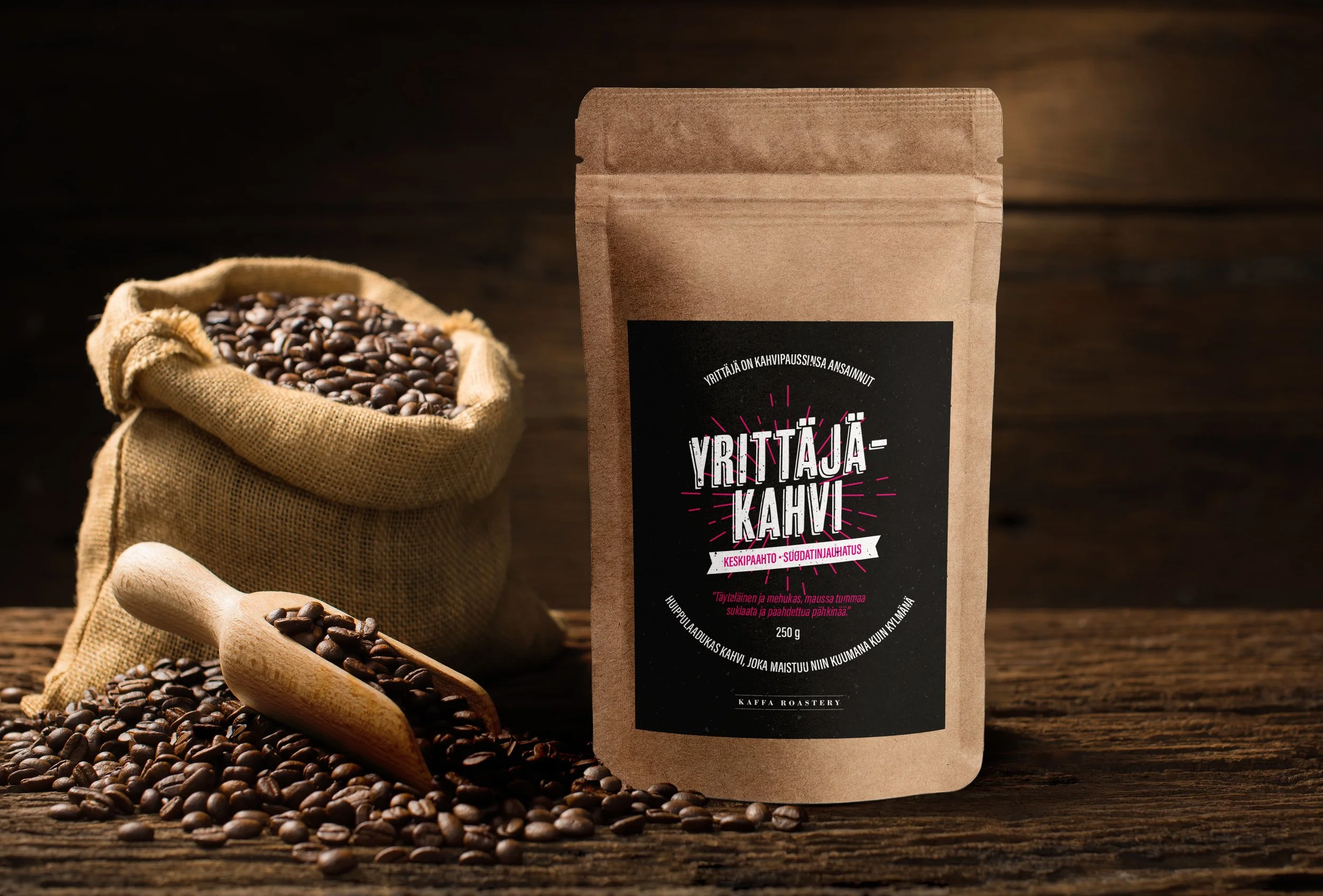 Pakettissa on aina tuoretta Yrittäjä -kahvia haluamasi määrä. Yksi kahvipaketti sisältää 250g Yrittäjä -Kahvia. Voit lukea lisää kahvista täältä: https://www.yrittajakahvi.com/